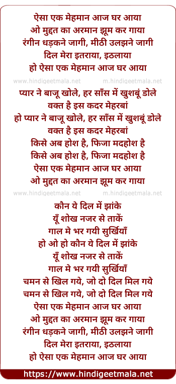 Lyrics of Aisa Ek Mehman Aaj Ghar Aaya - ऐसा एक मेहमान आज घर आया