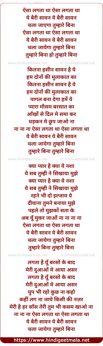 Lyrics of Aisa Lagta Tha Ye Bairi Sawan - ऐसा लगता था ये बैरी सावन