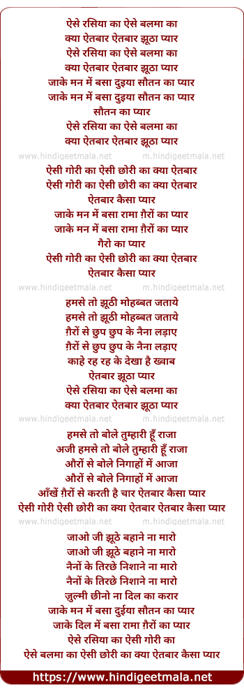 Lyrics of Aise Rasiya Ka Aisa Balma Ka Kya Aitbaar - ऐसे रसिया का ऐसे बलमा का क्या ऐतबार
