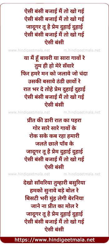Lyrics of Aisi Bansi Bajayi Main To Kho Gayi - ऐसी बंसी बजाई मैं तो खो गई