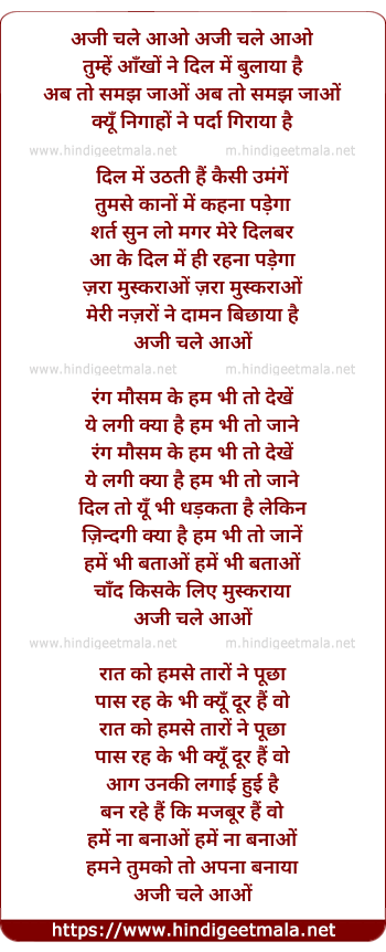 Lyrics of Aji Chale Aao, Tumhe Aankho Ne Dil Me Bulaya - अजी चले आओ, तुम्हें आँखों ने दिल में बुलाया है