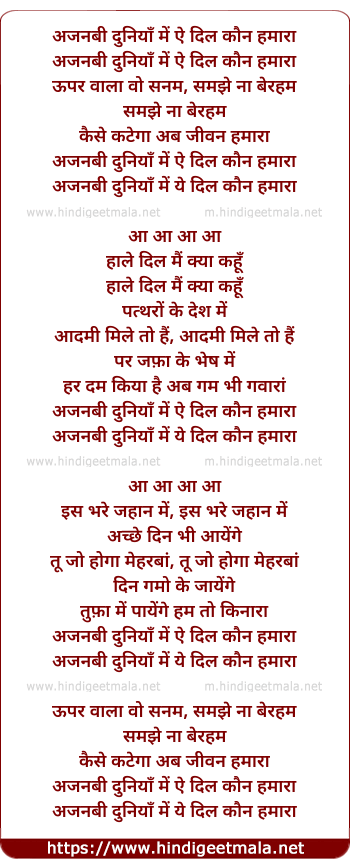 Lyrics of Ajnabi Duniya Me - अजनबी दुनियाँ में