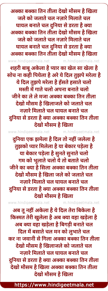 Lyrics of Aka Baka Tin Teela - अक्का बक्का तिन तीला