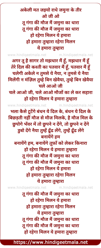name), to the middle of the river Jamuna "Tu ganga ki mauj main Jamuna ka