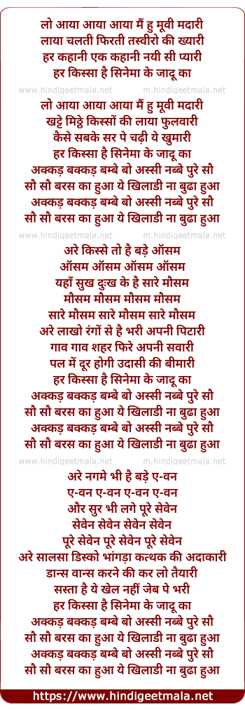Lyrics of Akkad Bakkad Bambe Bo Assi Nabbe Pure Sau - अक्कड़ बक्कड़ बम्बे बो अस्सी नब्बे पुरे सौ