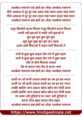 Lyrics of Albela Mastana Ek Hanso Ka Joda - अलबेला मस्ताना एक हंसो का जोड़ा अलबेला मस्ताना