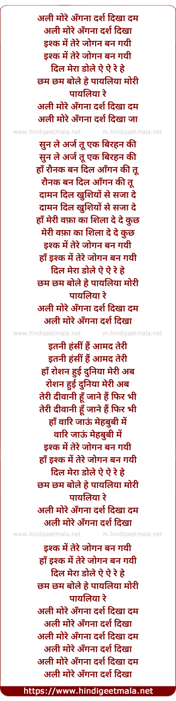 Lyrics of Alee More Angana - अली मोरे अँगना दर्श दिखा दम