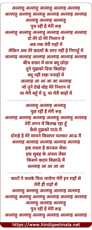 Lyrics of Allaah Hoo, Allaah Hoo - अल्ला हु अल्ला हु