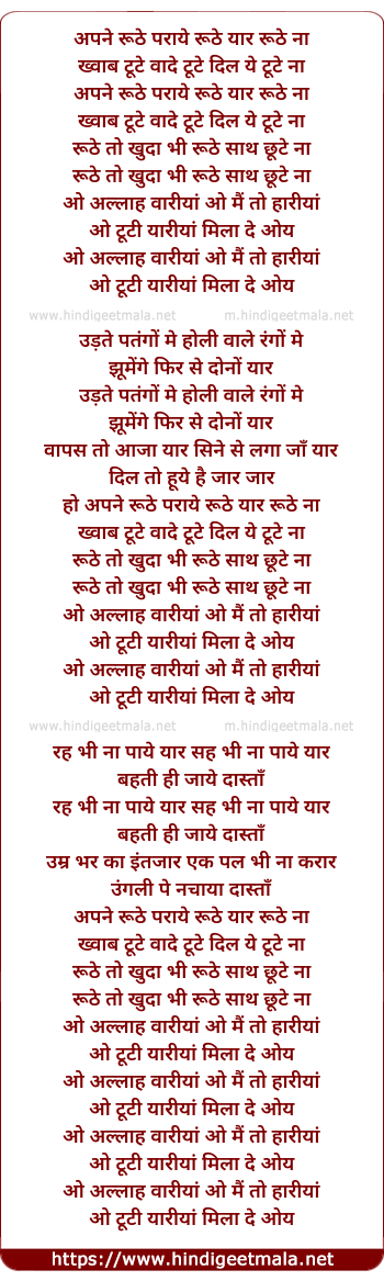 Lyrics of Allah Waariyan, Tuti Yaariyan Mila De - अल्लाह वारीयां, टूटी यारियां मिला दे