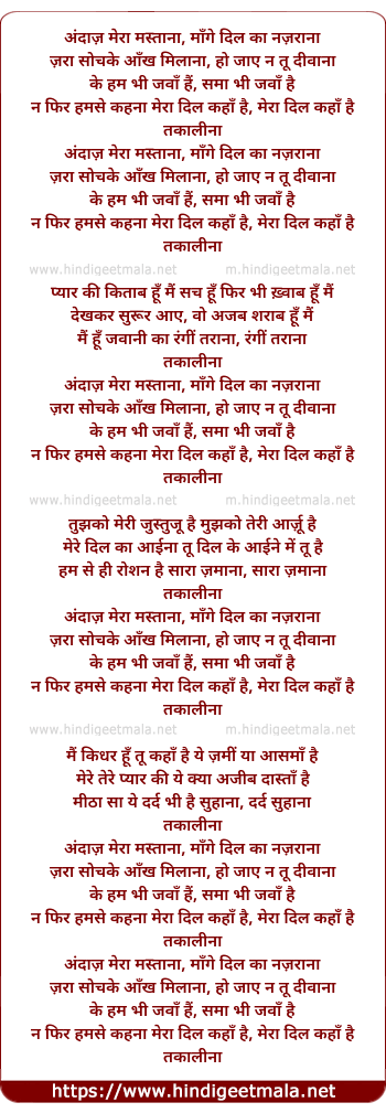 Lyrics of Andaz Mera Mastana, Mange Dil Ka Nazrana, Takaalinaa - अंदाज़ मेरा मस्ताना माँगे दिल का नज़राना