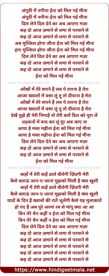 Lyrics of Anguthee Me Nagina Ina Ko Mil Gayee Mina - अंगूठी में नगीना ईना को मिल गई मीना