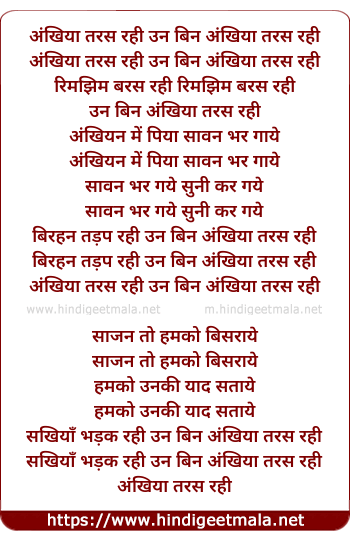 Lyrics of Ankhiya Taras Rahi Un Bin - अंखिया तरस रही उन बिन