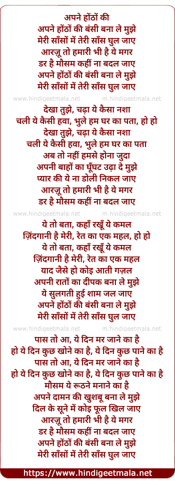 Lyrics of Apane Honthon Ki Bansi Banaale Mujhe - अपने होंठों की बंसी बना ले मुझे