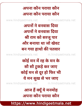 Lyrics of Apna Kaun Paraya Kaun - अपना कौन पराया कौन
