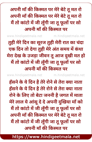 Lyrics of Apni Maa Ki Kismat Par Mere Bete Tu Mat Ro - अपनी माँ की किस्मत पर मेरे बेटे तू मत रो