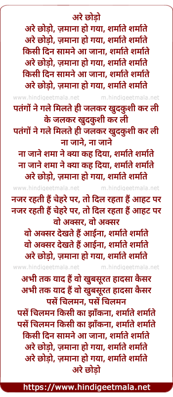 Lyrics of Are Chhodo, Zamaanaa Ho Gayaa, Sharamaate Sharmaate - अरे छोड़ो