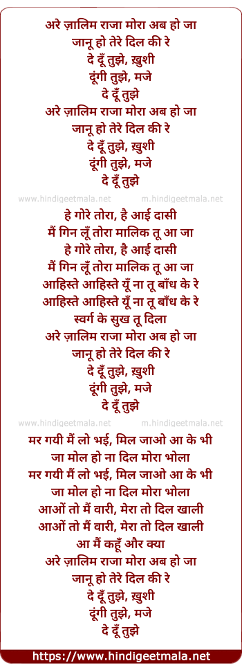 Lyrics of Are Zaalim Raja Mora - अरे ज़ालिम राजा मोरा