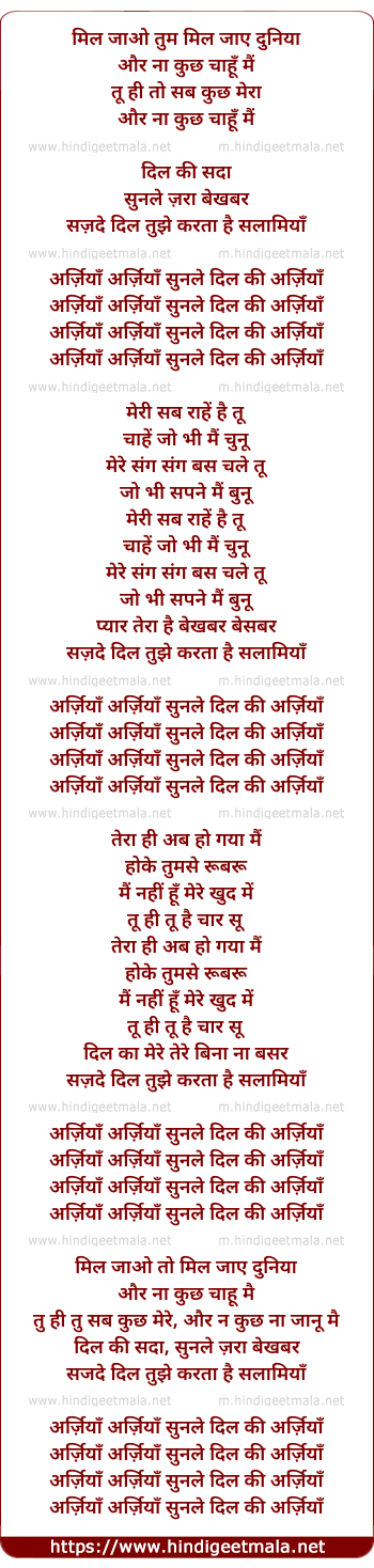 Lyrics of Arziyan Arziyan Sunle Dil Ki Arziya - अर्ज़ियाँ अर्ज़ियाँ सुनले दिल की अर्ज़ियाँ