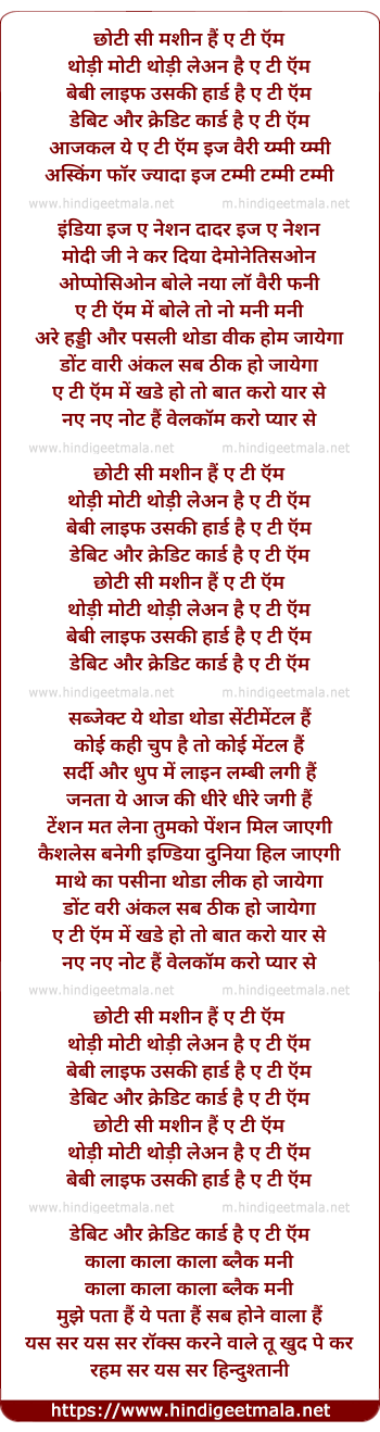 Lyrics of Choti Si Machine Hai ATM - छोटी सी मशीन है एटीएम