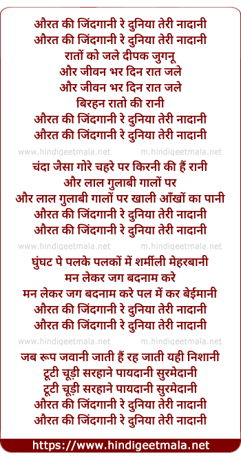 Lyrics of Aurat Ki Zindgani Re Duniya Teri Nadani - औरत की जिंदगानी रे दुनिया तेरी नादानी