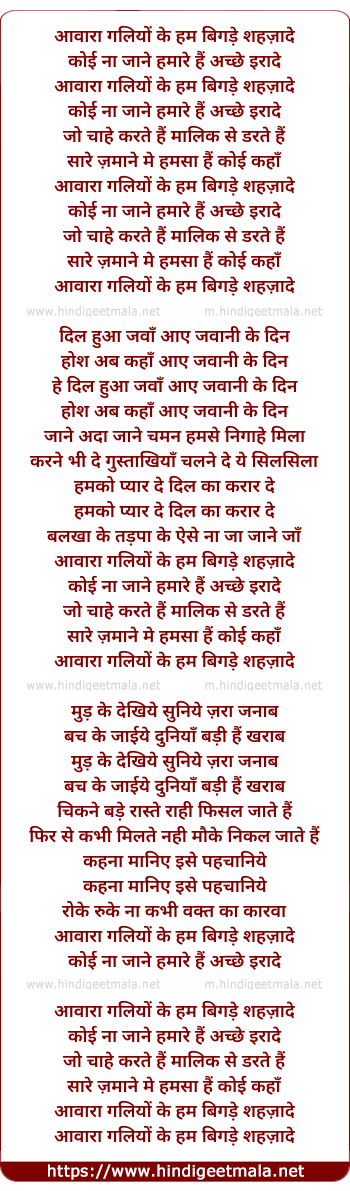 Lyrics of Awara Galiyo Ke Hum Bighde Sehjade - आवारा गलियों के हम बिगड़े शहज़ादे