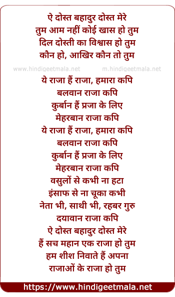 Lyrics of Aye Dost Bahadur Dost - ऐ दोस्त बहादुर दोस्त मेरे