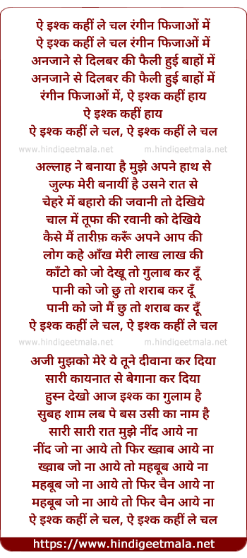 Lyrics of Aye Ishk Kahi Le Chal - ऐ इश्क कहीं ले चल