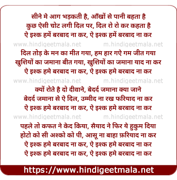 Lyrics of Aye Ishq Hame Barbad Na Kar (Sine Me Aag Bhadkti Hai) - सीने मे आग भड़कती है, आँखों से पानी बहता है