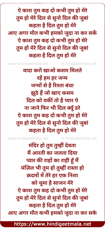 Lyrics of Aye Kash Tum Kehdo Kabhi Tum Ho Mere, Dil Ki Suno Dil Ki Juba - ऐ काश तुम कह दो कभी तुम हो मेरे,दिल की सुनो दिल की जुबां