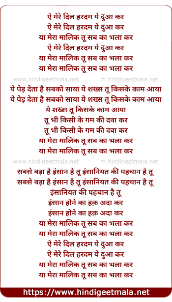 Lyrics of Aye Mere Dil Hardam Yeh Dua Kar (4) - ऐ मेरे दिल हरदम ये दुआ कर
