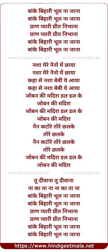 Lyrics of Banke Bihari Bhool Naa Jana - बांके बिहारी भूल ना जाना