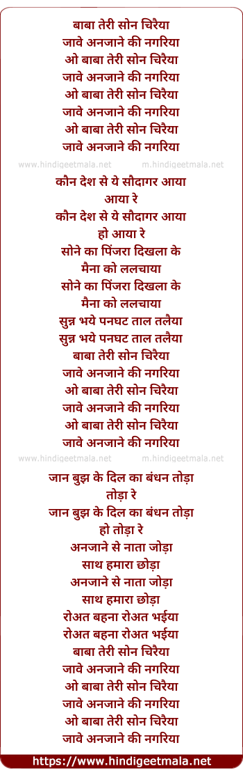Lyrics of Baba Teri Son Chiraiya - बाबा तेरी सोन चिरैया