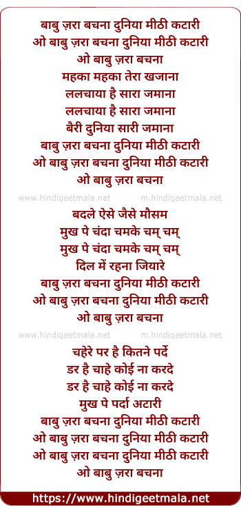 Lyrics of Babu Zara Bachna Duniya Mithi Kataar