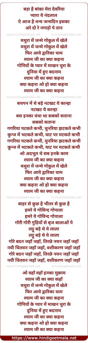 Lyrics of Bada Hai Banka Mera Devriya Pyara Ye Nandalal - बड़ा है बांका मेरा देवरिया प्यारा ये नन्दलाल