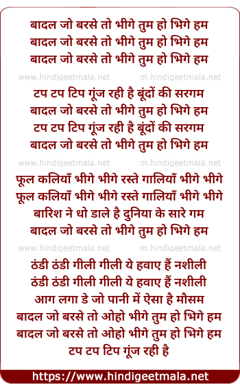 Lyrics of Badal Jo Barse Toh Bhige Tum Bhige Hum - बादल जो बरसे तो भीगे तुम हो भिगे हम