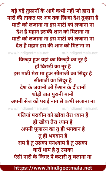 Lyrics of Bade Bade Tufaanon Ke Aage, Maati Ko Laajaanaa Naa - हे: बड़े बड़े तुफ़ानोँ के आगे कभी नहीं जो हारा है