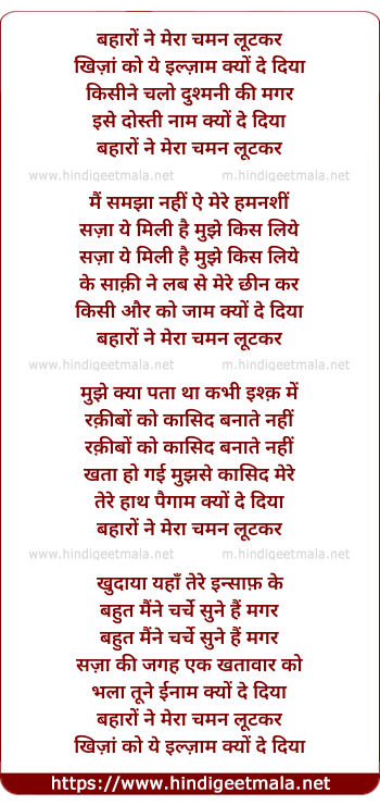 Lyrics of Bahaaron Ne Meraa Chaman Lutakar - बहारों ने मेरा चमन लूटकर