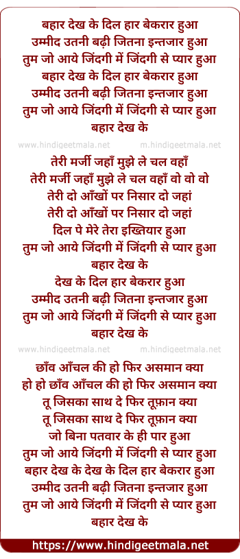 Lyrics of Bahar Dekh Ke Dil Aur Bekarar Hua - बहार देख के दिल हार बेकरार हुआ