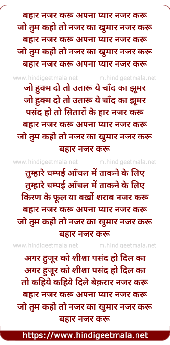 Lyrics of Bahar Nazar Karu Apna Pyar Nazar Karu - बहार नजर करू अपना प्यार नजर करू