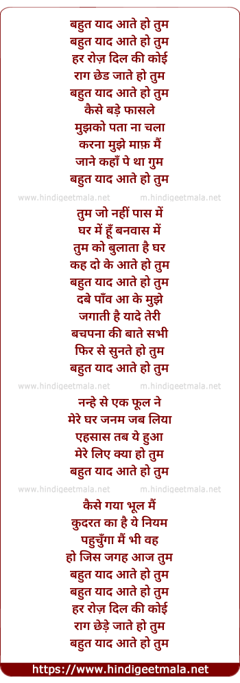 Lyrics of Bahut Yaad Aate Ho - बहुत याद आते हो