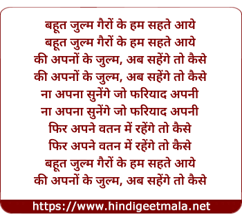 Lyrics of Bahut Zulm Gairo Ke Hum Sehte Aaye, Ke Apno Julm Ab Sahenge Toh Kaise - बहूत जुल्म गैरों के हम सहते आये, के अपनों जुल्म अब सहेंगे तो कैसे