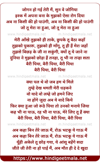 Lyrics of Bairi Piya - जोगन हो गई तेरी मैं, सुन वे जोगिया