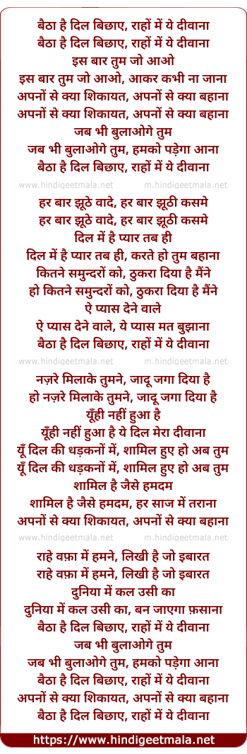 Lyrics of Baithe Hai Dil Bichhaye - बैठा है दिल बिछाए, राहों में ये दीवाना