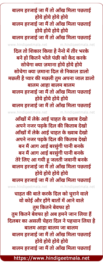 Lyrics of Balam Harjaiyi Ja Mai To Aankh Mila Pachatayi - बालम हरजाई जा मैं तो आँख मिला पछताई