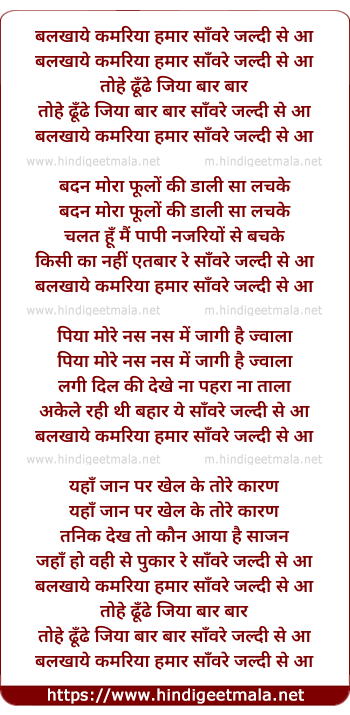 Lyrics of Balkhaye Qamariya Humar Sanware - बलखाये कमरिया हमार साँवरे
