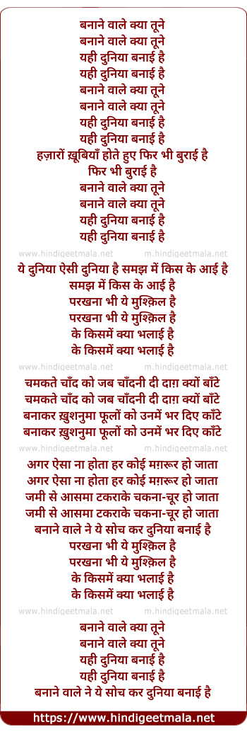Lyrics of Banane Vale Kya Tune Yahi Duniya Basai Hai - बनाने वाले क्या तूने यही दुनिया बसाई है