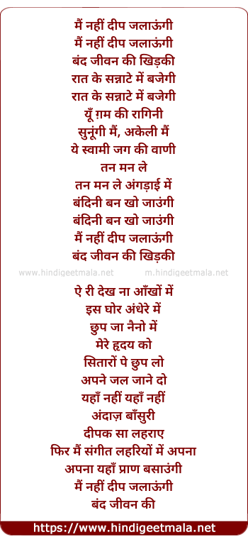 Lyrics of Band Jeevan Ki Khidki - मैं नहीं दीप जलाऊंगी