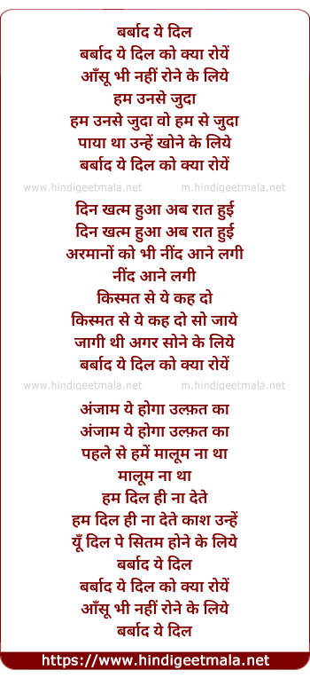 Lyrics of Barbadiye Dil Ko Kya Roye - बर्बाद ये दिल