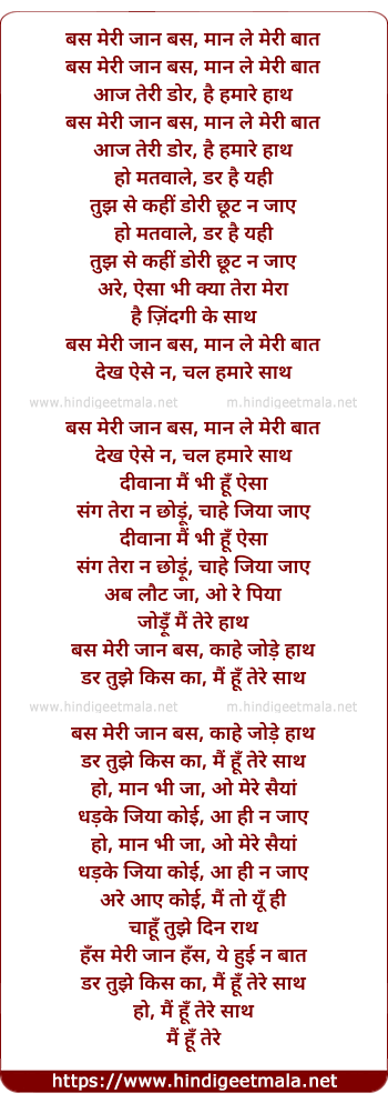 Lyrics of Bas Meri Jaan Bas, Maan Le Meri Baat - बस मेरी जान बस, मान ले मेरी बात