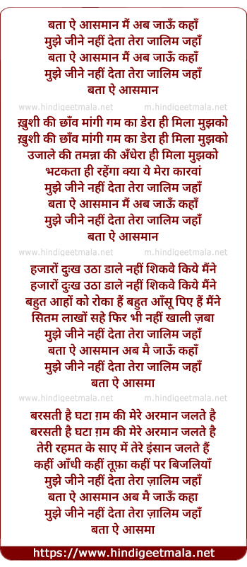 Lyrics of Bata Ae Aasman Mai Ab Jau Kaha - बता ऐ आसमान मैं अब जाऊँ कहाँ